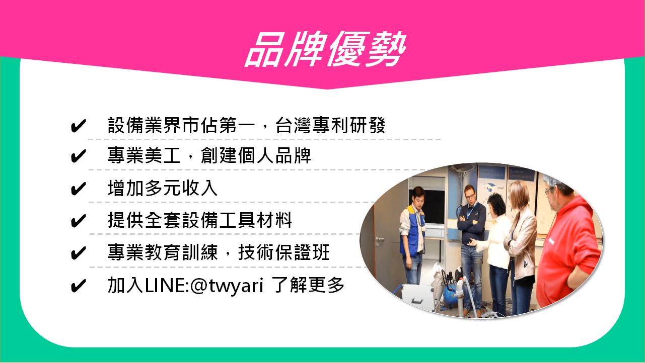 清洗水管 技術轉移 目前位置 > 技術轉移說明 觀看更多 雅銳實績 本公司為雅銳YARI高週波水管清洗源頭研發製造商,兼技術轉移訓練中心,提供最新水管清洗設備與清洗工法... 【 看更多資訊 】 設備介紹 真正設備製造商,業界生產最多功能最多機種,不論您看到的哪一家設備我們皆有生產,ODM代工,凡是直接對我司採購者皆有優惠價... 【 看更多資訊 】 YARI技術 利用水與氣體「空蝕效應」產生之震波/氣泡爆裂/震盪剝離/水錘效應/將管路內壁的污垢與生物膜清洗剝離進而從水龍頭排出... 【 看更多資訊 】 後勤資源 終身技術後勤/各項技術訓練/行銷策略/形象包裝/營繕保險,周全的後勤支援,購買設備全國皆可接單,並提供全國業務交叉支援... 【 看更多資訊 】 加盟專區 總部包全套工具設備,提供支援服務,免加盟金、免權利金、免保證金一次簽約、永久有效。且針對經濟困難者可提供分期付款專案... 【 看更多資訊 】 24小時服務專線 0911-760-440 TEL:0911760440 傳真:04-8871925 LINE ID :@twyari LINE ID : 0966440774 E-mail:twyarico@gmail.com 水管補漏加盟 水管清洗加盟 若您想參加免費說明會↓↓↓ 先選擇場次↓ 【中部-彰化北斗總部】週一到週六,上午10點 【中部-彰化北斗總部】週一到週六,下午1點半 您的姓名(必填) 聯絡電話(必填) 居住縣市 選擇 台北市 新北市 台中市 台南市 高雄市 基隆市 新竹市 嘉義市 桃園縣 新竹縣 苗栗縣 彰化縣 南投縣 雲林縣 嘉義縣 屏東縣 宜蘭縣 花蓮縣 台東縣 澎湖縣 金門縣 連江縣 LINE ID (選填) 電子郵件 (必填) 填好送出